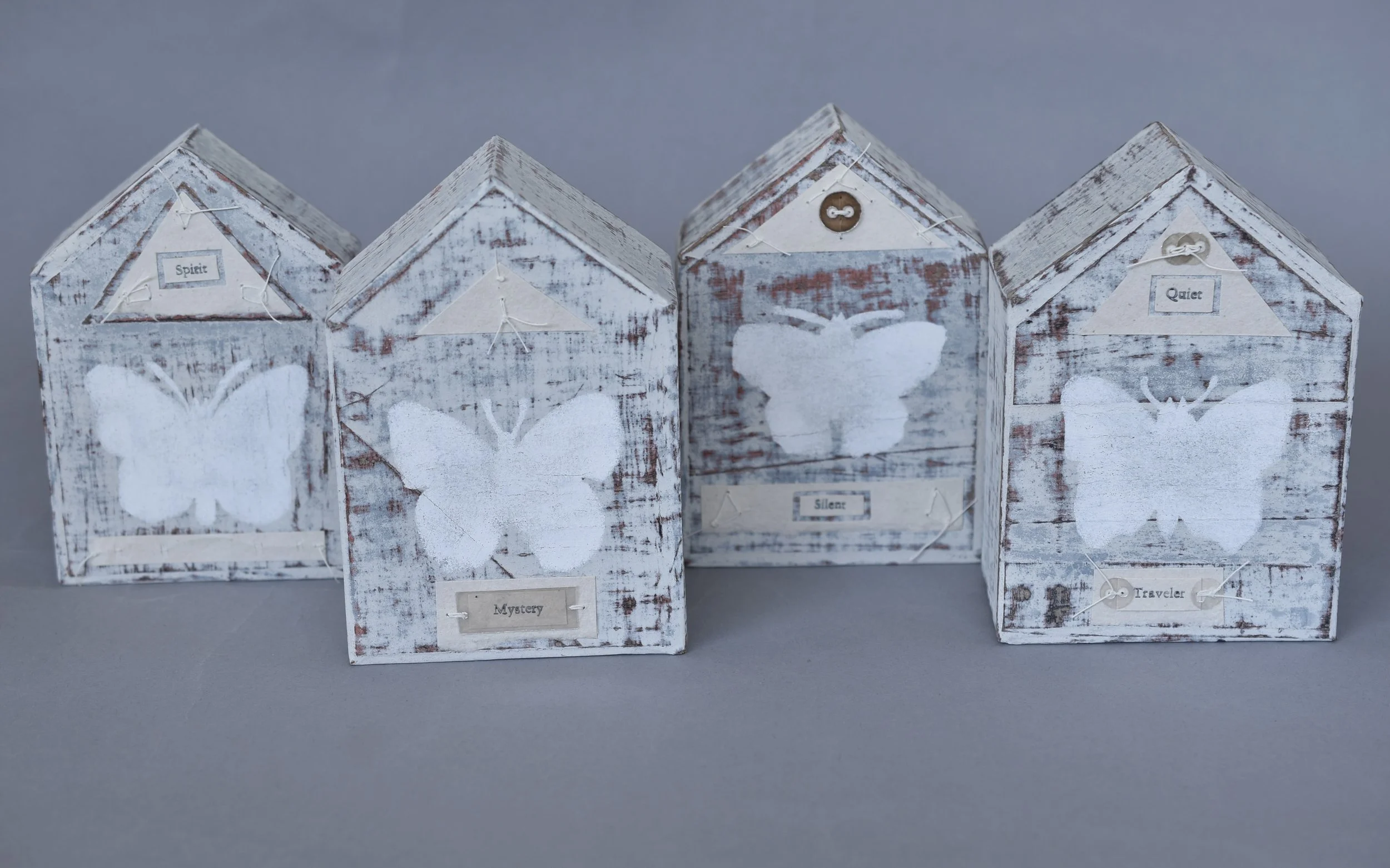 Davey board, papyrus, milk paint. mica, linen thread, handmade cotton and abaca paper with imbedded mica, relief prints and text using metal type were letterpress printed. Open front pieces measure 5”x3.5”x1.5”, solid front pieces measure 5”x3.5”x2”