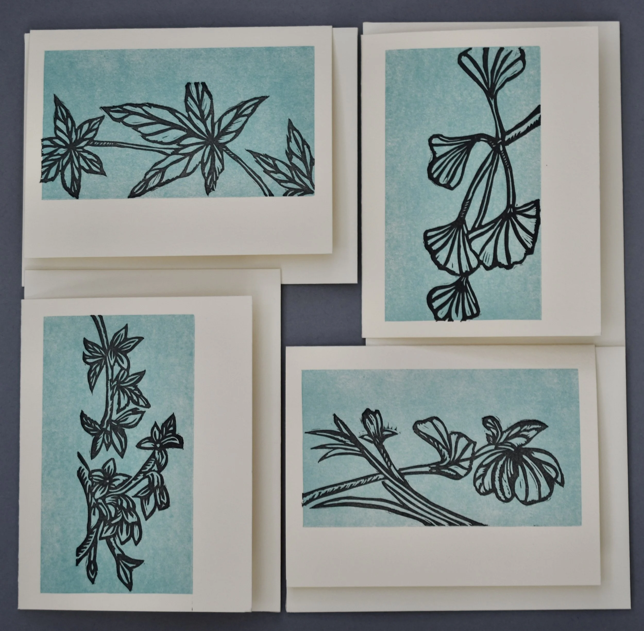 Letterpress printed relief prints on Lettra paper, blank inside. Vertical cards measure 5.25”x4”, horizontal cards measure 4”x5.25”.