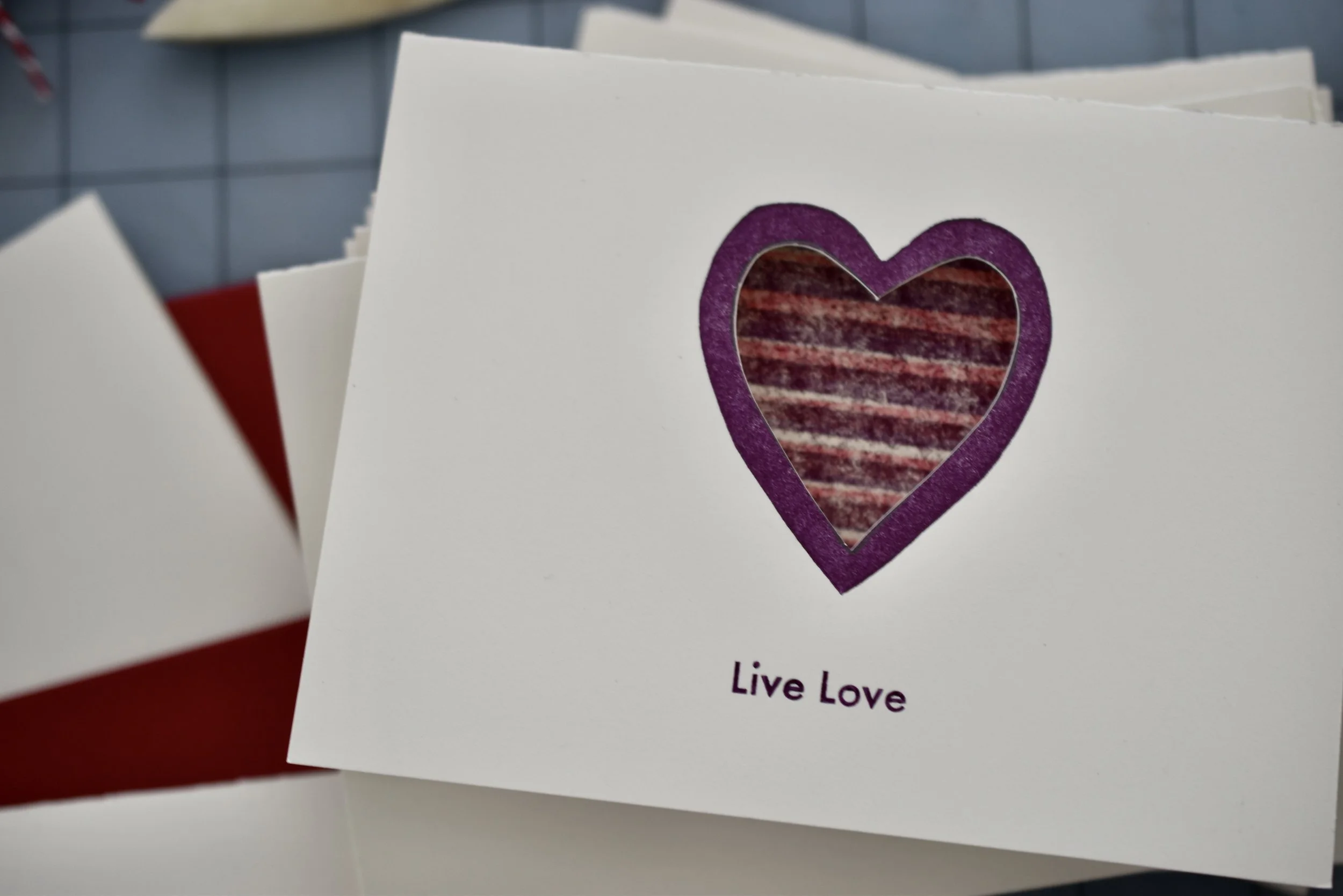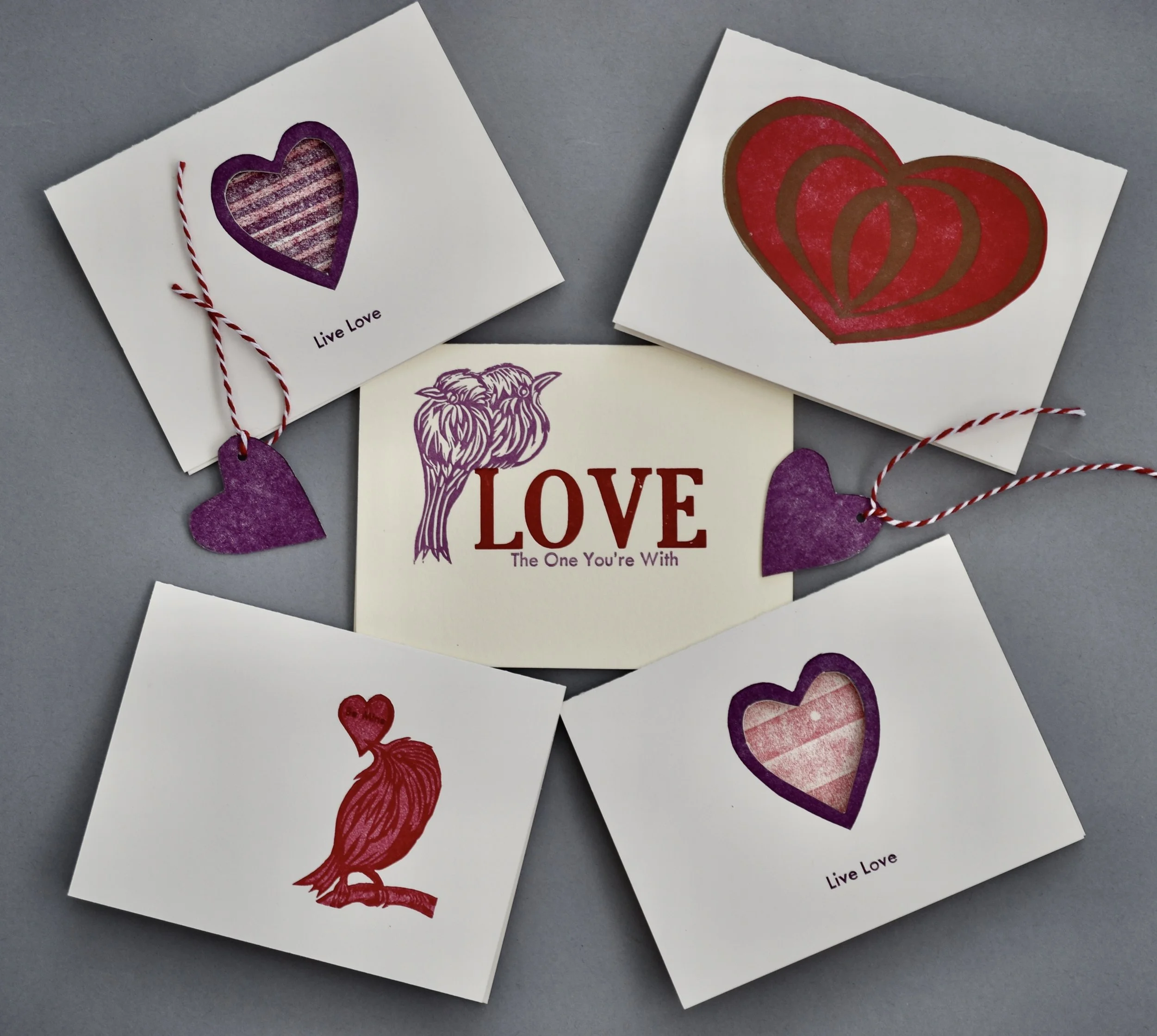 Various Valentines using antique wood type, metal type, and relief prints. All are letterpress printed on Lettra paper, chipboard, and Cougar Natural cover weight paper. Vertical measures 5.25”x4”; horizontal measures 4”x5.25”.