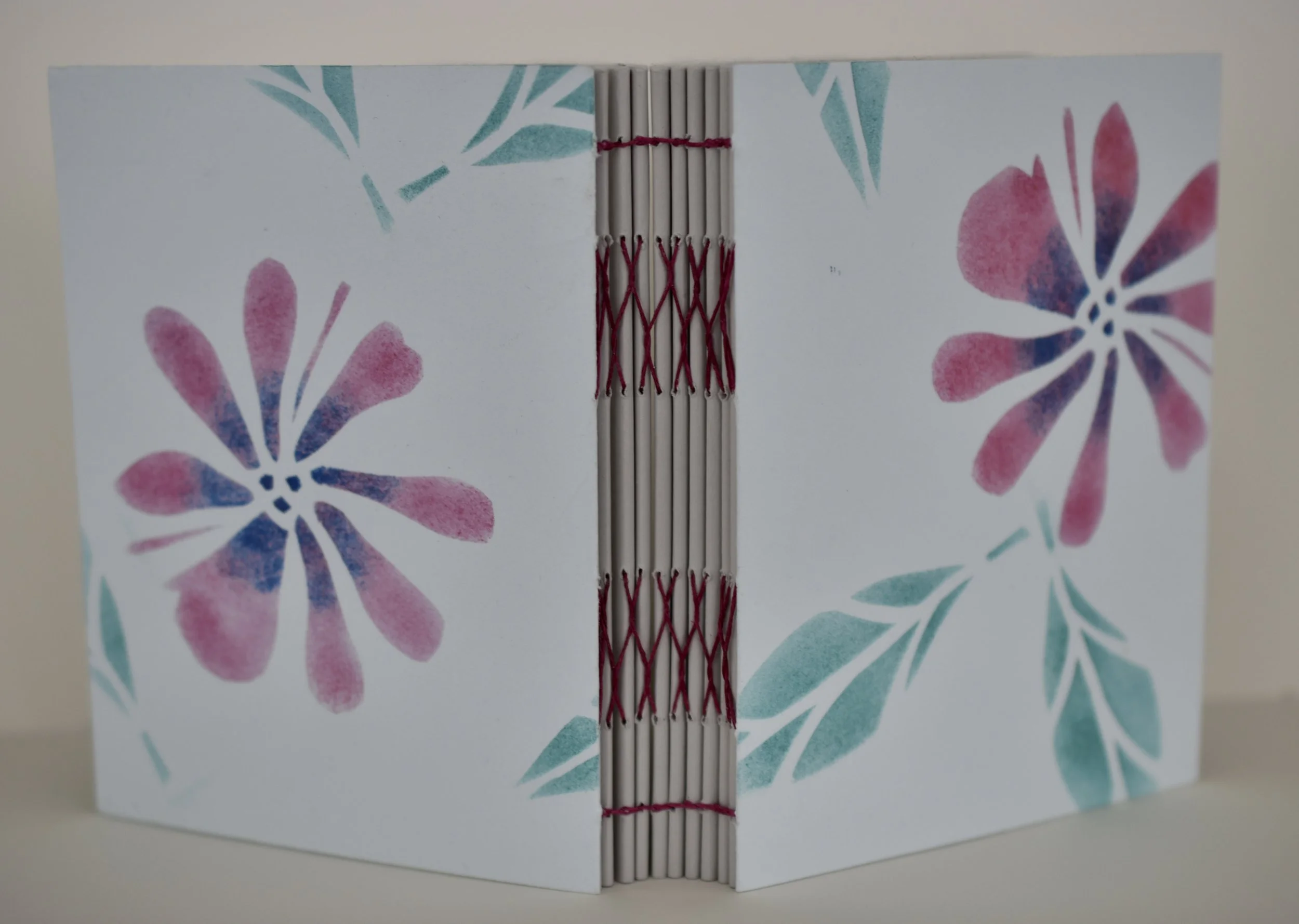 Blank journal using Stonehenge and Neenah Environment papers, waxed linen thread. The covers are adorned with stencil printed botanicals. The book measures 5.5”x4.25”x1.25 closed.